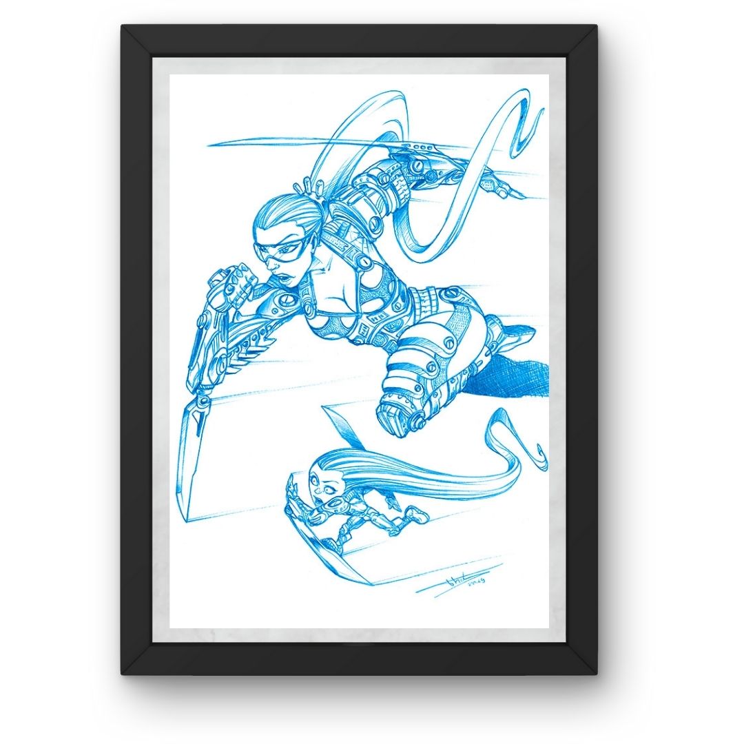 Cette illustration originale au stylo bille témoigne d’une recherche constante sur la texture et le volume. Contrairement au graphite, le stylo bille offre une couleur permanente et une brillance subtile qui ne s’altère pas avec le temps.