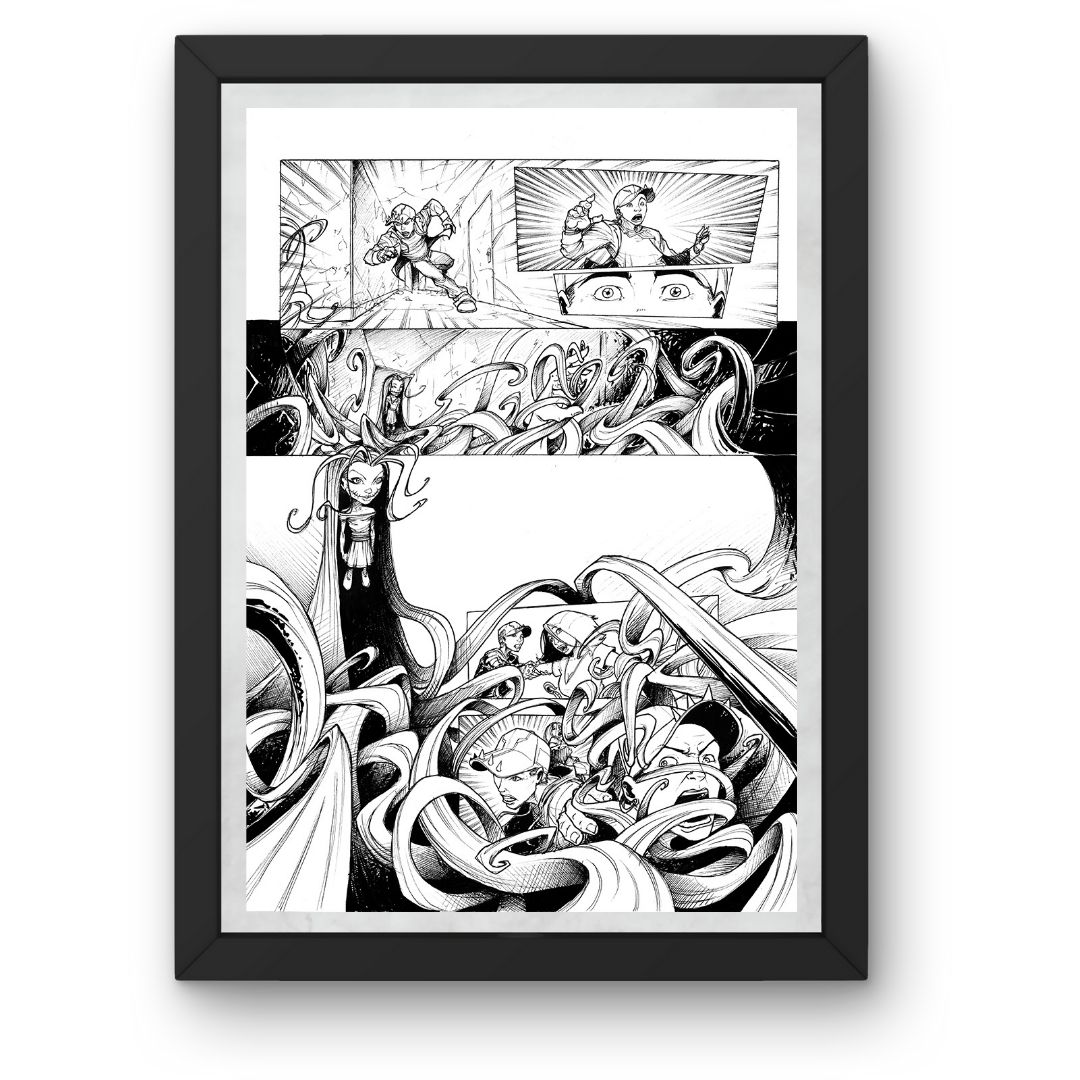 Cette planche de bande dessinée originale illustre un moment clé de l’ouvrage Nightmare. Chaque case a été composée avec soin pour respecter le rythme narratif du projet.