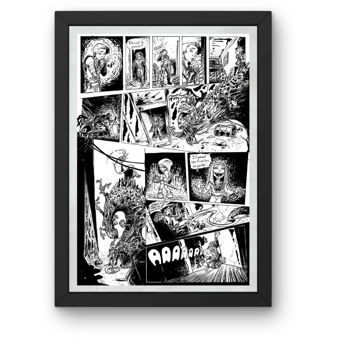 Cette planche de bande dessinée originale illustre un moment clé de l’ouvrage Nightmare. Chaque case a été composée avec soin pour respecter le rythme narratif du projet.