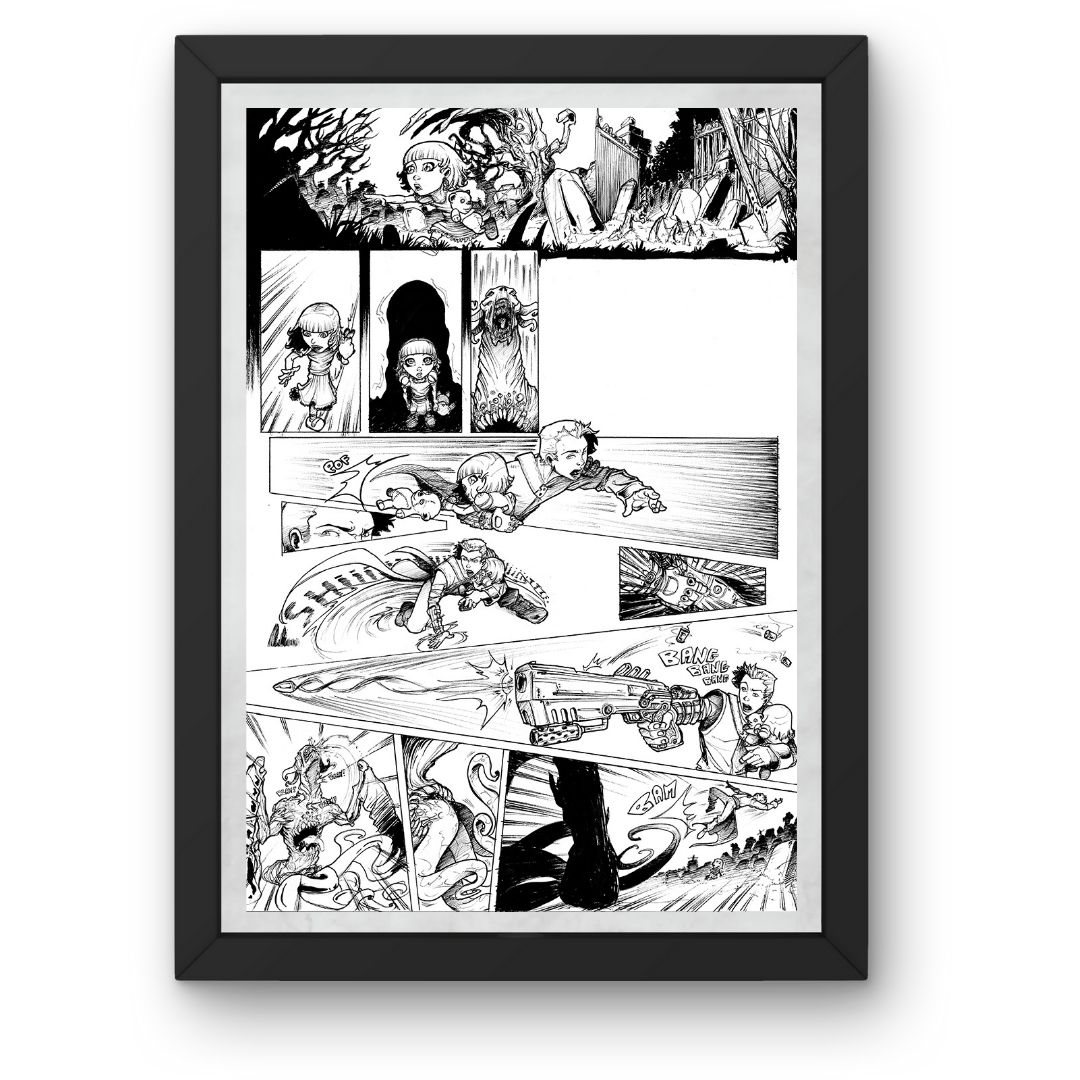 Cette planche de bande dessinée originale illustre un moment clé de l’ouvrage Nightmare. Chaque case a été composée avec soin pour respecter le rythme narratif du projet.