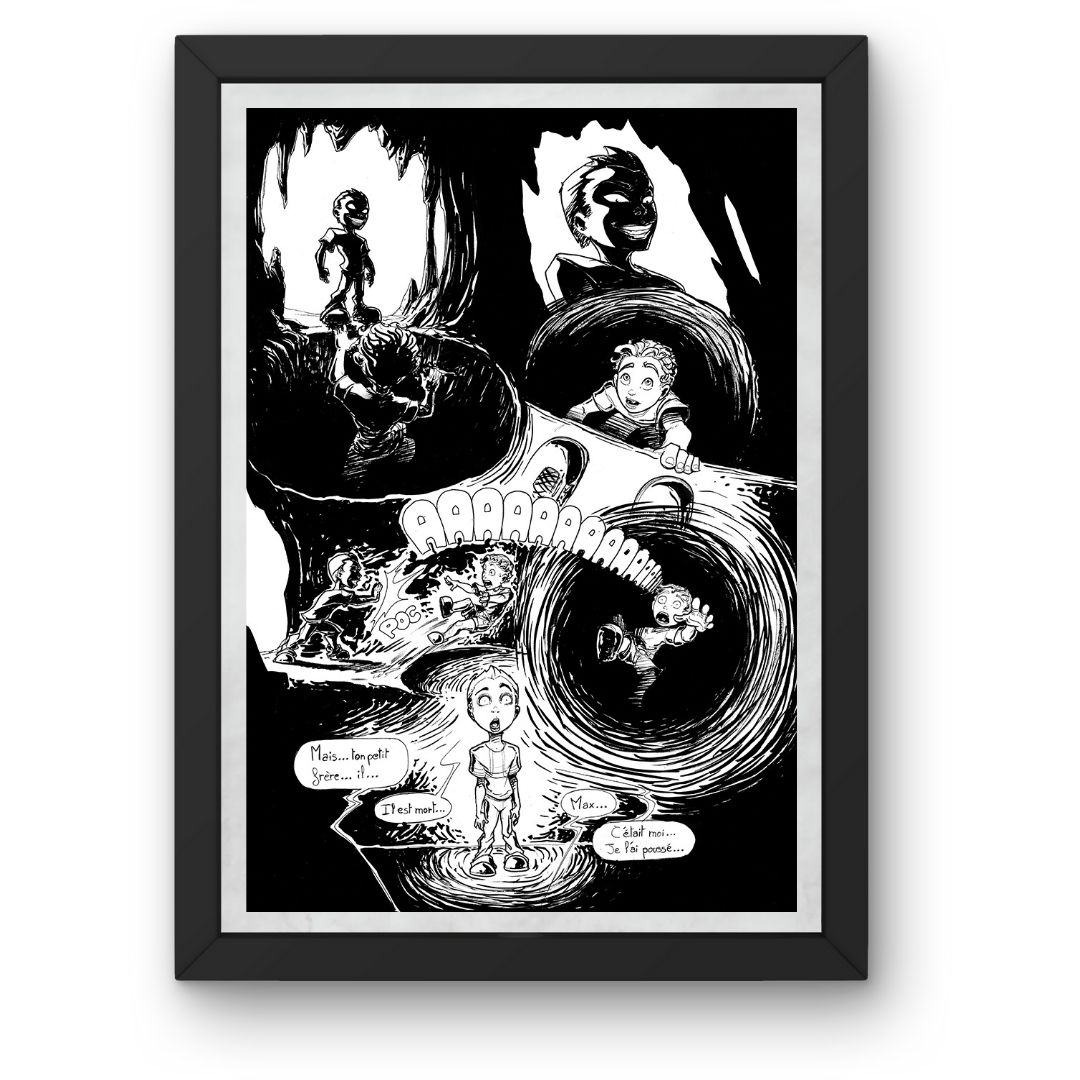 Cette planche de bande dessinée originale illustre un moment clé de l’ouvrage Nightmare. Chaque case a été composée avec soin pour respecter le rythme narratif du projet.
